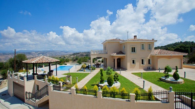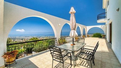 Five-Bedroom three-storey villa located in the hills of Tala it enjoys panoramic views of the Paphos coastline from Paphos International Airport to the Akamas. The covered area of the villa is approx 500 sq metres and the plot is approx 1,100 sq metres. Although there is currently no Pool, there is ample space and planning permission for one to be added in the Grounds.