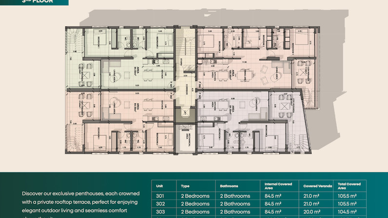 The exclusive third floor offers a limited collection of luxury penthouse apartments, each benefiting from a private rooftop garden designed for elevated outdoor living.