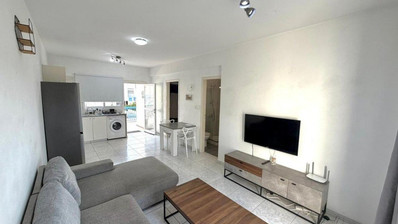 Modern one Bedroom apartment in a well-maintained complex with a beautiful communal swimming pool and private parking. The apartment features brand air conditioning throughout, brand new modern furniture, and is fully equipped with electrical appliances. Spacious kitchen and living room area. Covered veranda with furniture. Fully equipped with cutlery and everything needed for comfortable living. Close to elementary and high schools. Only 5 minutes’ walk to the beach.